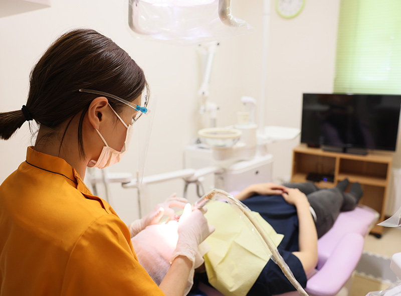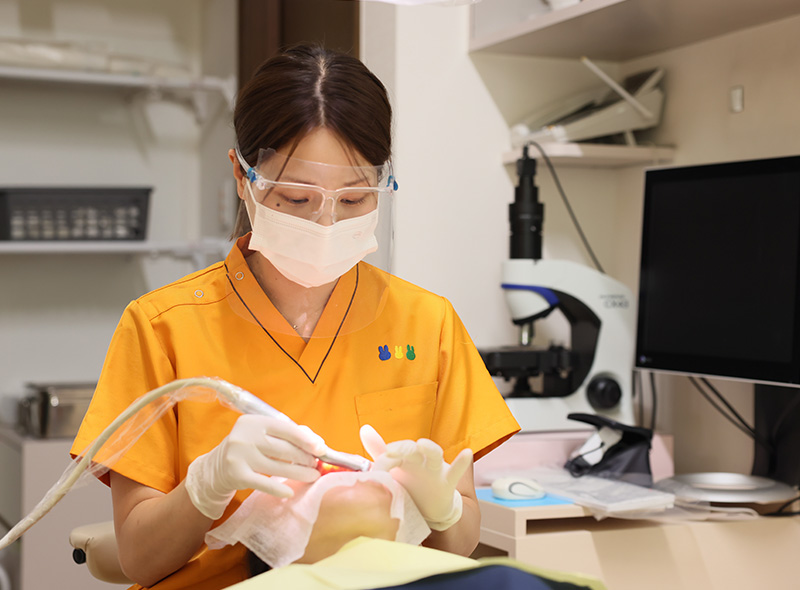 設備のひとつに、マイクロスコープを導入している当院。日本顕微鏡歯科学会認定医である副院長は基本的に、すべての治療にマイクロスコープを使用しています。日本の歯科医院におけるマイクロスコープの普及率は、10%と言われています。まだまだ普及しているとは言い難い状況ですが、当院では院長や副院長がマイクロスコープの重要性を深く理解しているため、こうした先進医療機器を積極的に導入し、「精密治療」に取り組んでいます。歯科衛生士が担当する処置についても、希望すればマイクロスコープを使用したスケーリングやPMTCの指導を行います。