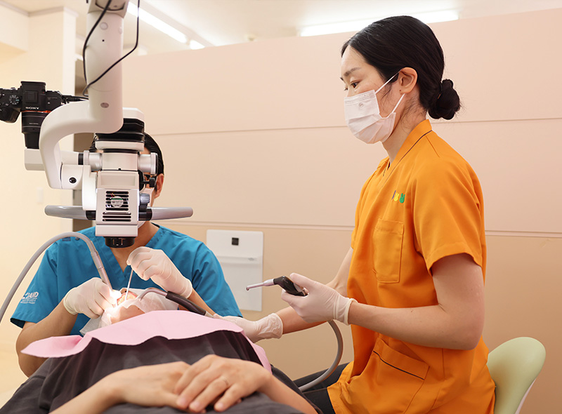 診療では、マイクロスコープを用いた精密診療を実践。歯科医師、歯科衛生士、歯科助手、受付が、それぞれの持ち場で責任を持って自分自身の仕事を遂行します。スタッフ全員で助け合い、協力し合いながら診療を行っています